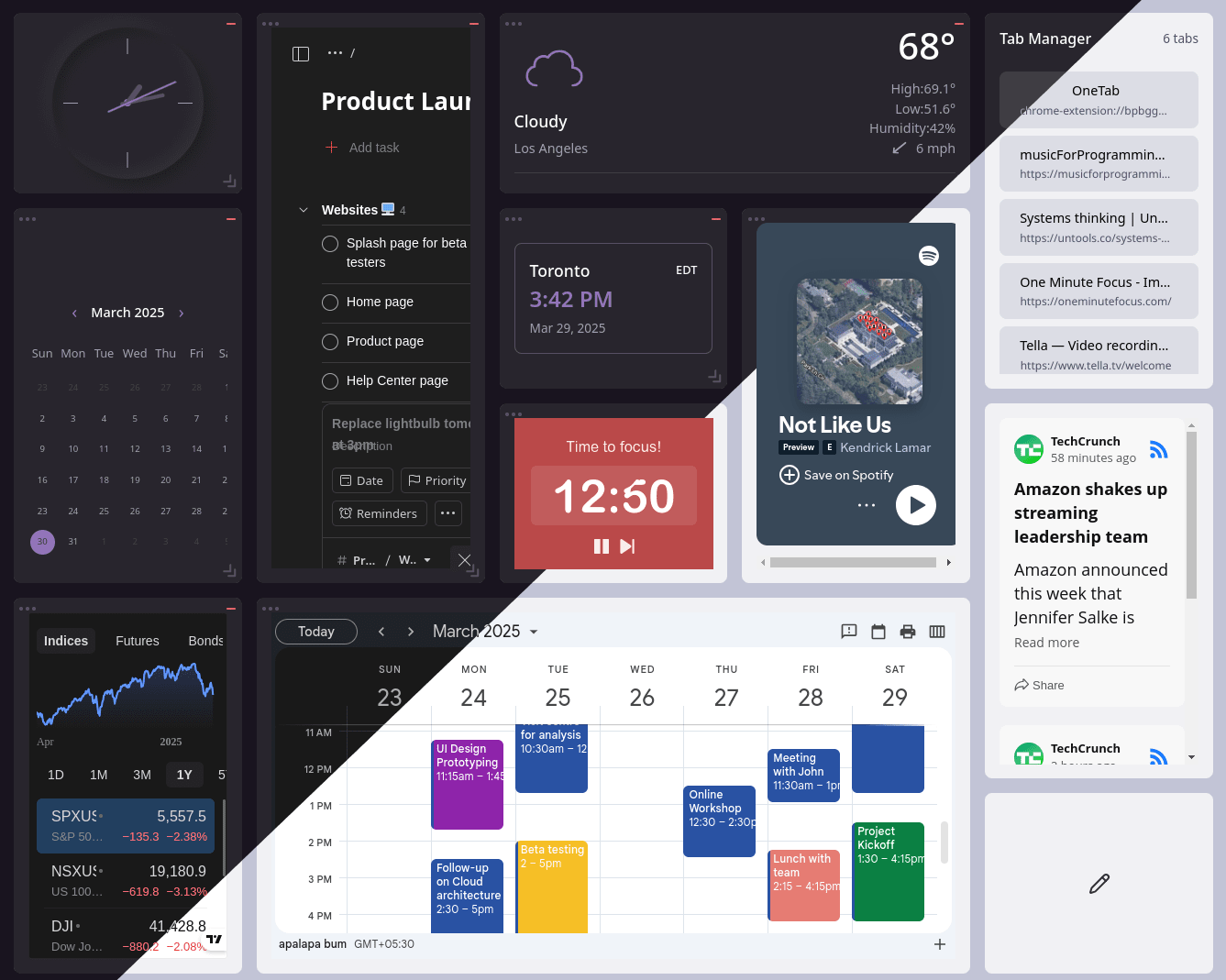 Get everything you need - đź“…Calendar, â›…Weather, đź’¸Stocks, and âś…Tasks - in ONE place, arranged YOUR way.